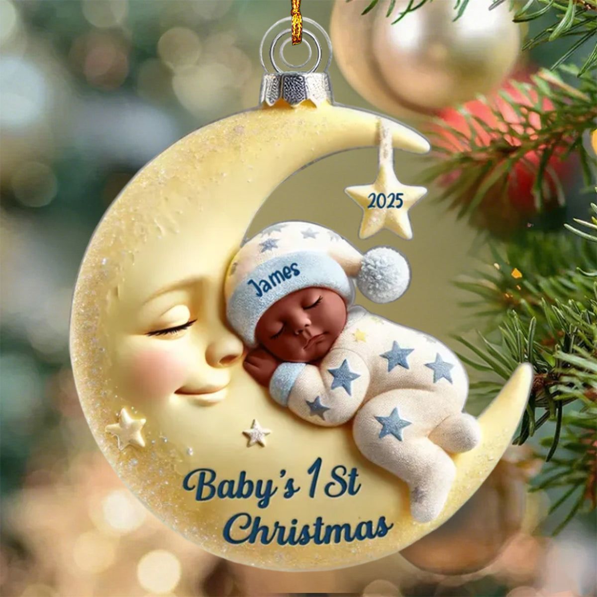 Exklusives, herzerwärmendes Design: Ein einzigartiges Baby-auf-dem-Mond-Bild, das pure Freude hervorruft und es zu einem herausragenden Stück für Ihre Weihnachtsdekoration macht.