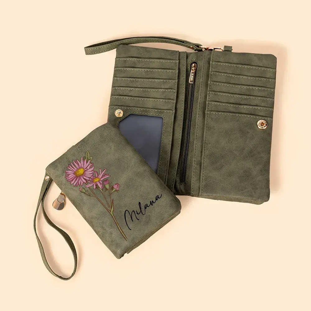 Benutzer definierter Name Aquarell-Geburts blume Tri-Fold-Armband-Geldbörse, Leder karten halter mit Handgelenk gurt, Geburtstags jubiläum Weihnachts geschenk für Frauen