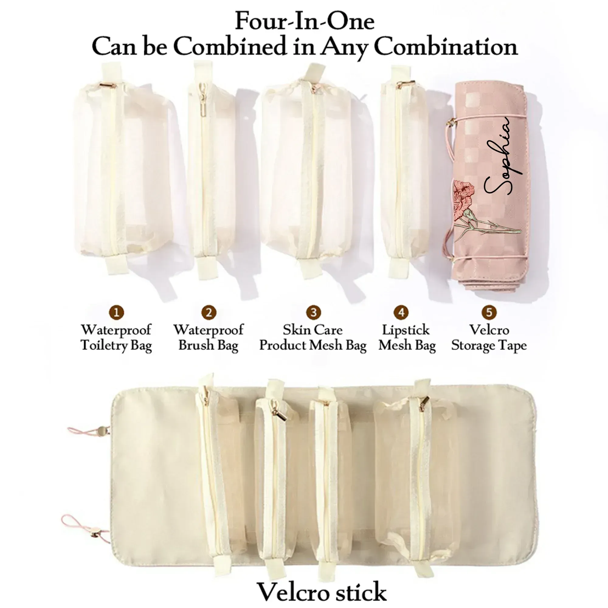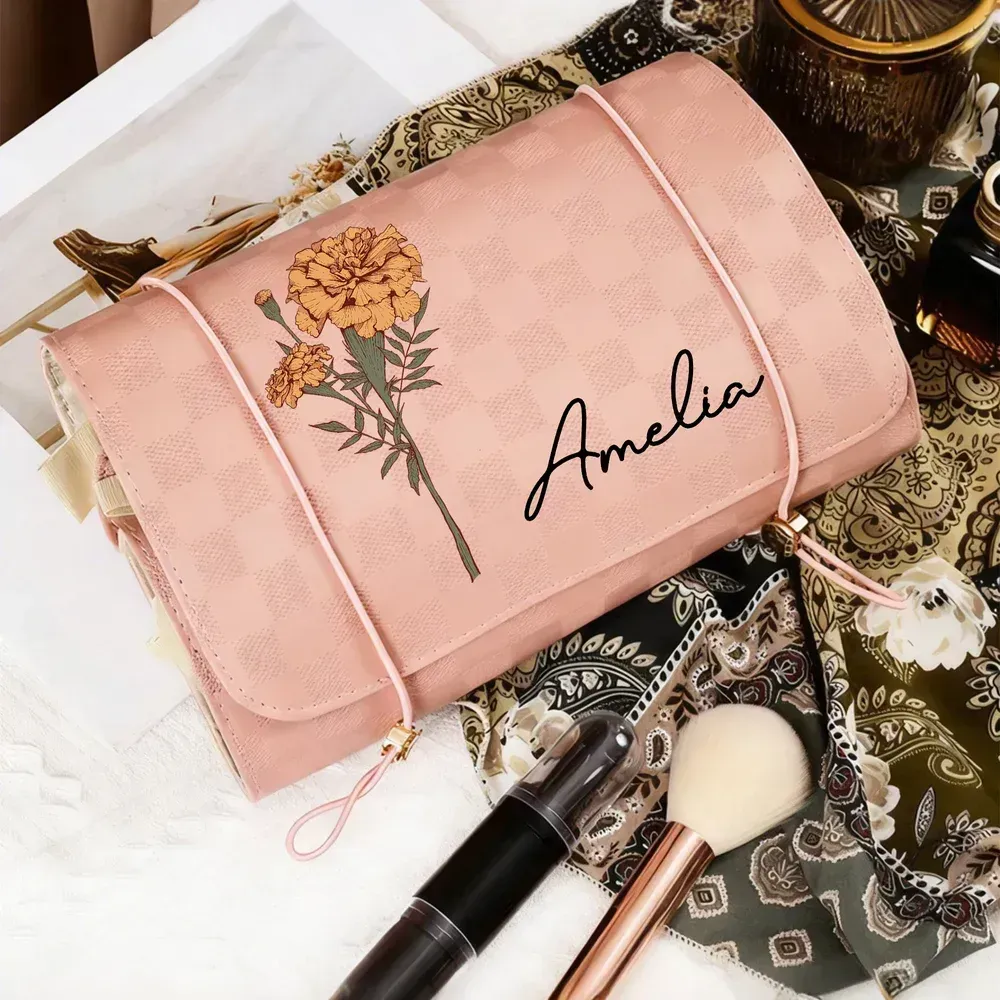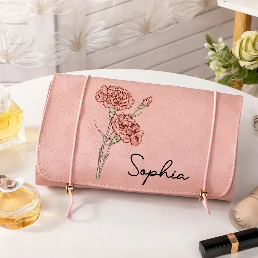 Personalisierte, zarte Kosmetiktasche aus PU-Leder mit Geburtsblume und Namen – ideal für Reisen, den Alltag und als Geburtstagsgeschenk für Frauen