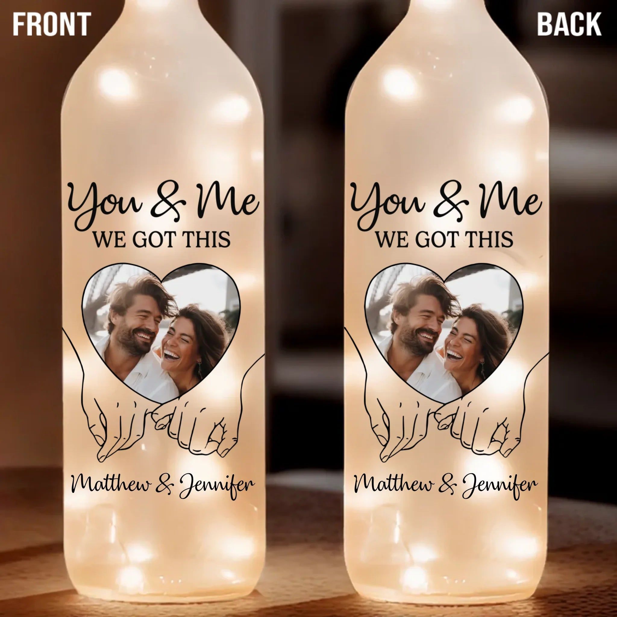 Fotoflaschenlampe mit Aufdruck – Personalisierte Jubiläums- und Hochzeitsgeschenke für Ehepaare – Hand in Hand meistern wir alles